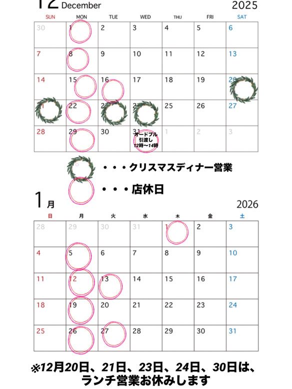 2月の店休日は、月曜日と10、24日火曜日となります。